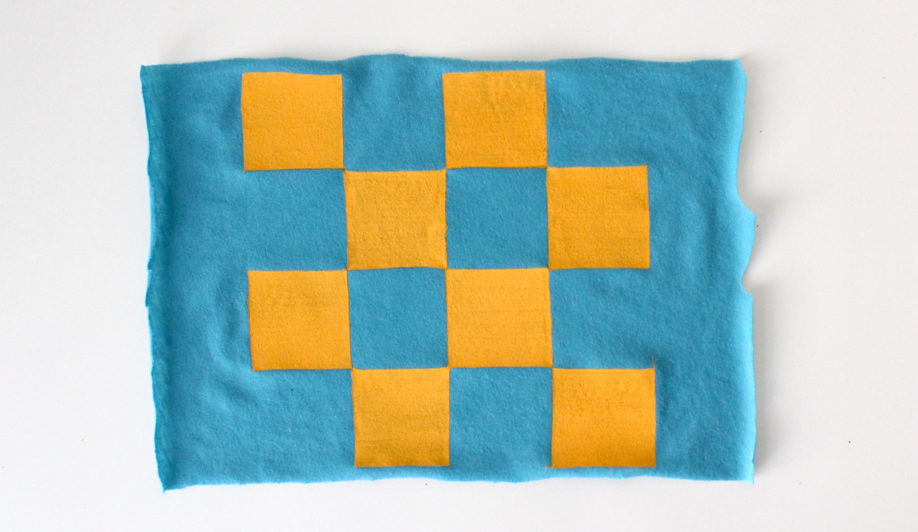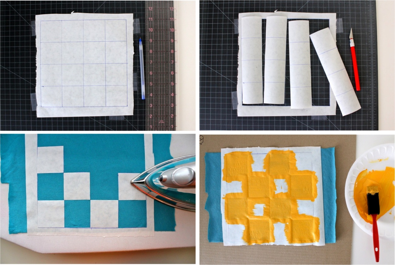 Tape a large piece of Freezer Paper to a cutting mat, draw an 8×8 inch square (or any size you want), then draw 2×2 inch squares in the middle. You could be really precise and only cut out every other square with your cutting knife. But it’s easier to cut out the entire square first, cut out four lines, then use scissors to cut out 8 squares from those pieces. Iron the outer square to your fabric first, then iron every other square to the fabric. Paint, dry, and peel!