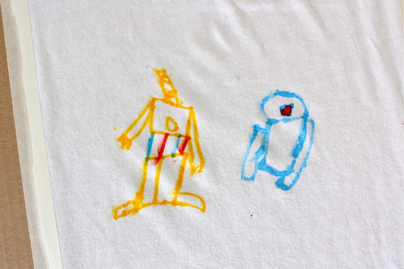 Owen is a Star Wars fanatic. Lover? Obsessor? Yes. So we tried out these Crayola Fabric markers. I taped white knit fabric to cardboard and he did his best C3PO and R2D2. I had to help him hold the fabric taut as he drew. But…(*Update*) some of you mentioned to iron freezer paper on the back of the knit fabric to stabilize it while drawing on the front side. Brilliant! Totally doing that next time.