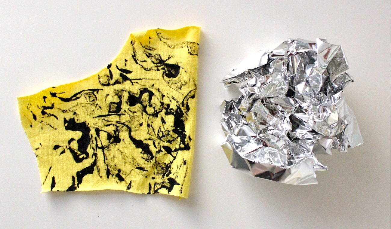 There are so many items around the house that will make interesting designs. Try a sponge, feathers, coins? noodles, string, yarn, etc. Here’s what it looks like when you crumple foil and dip it in paint: