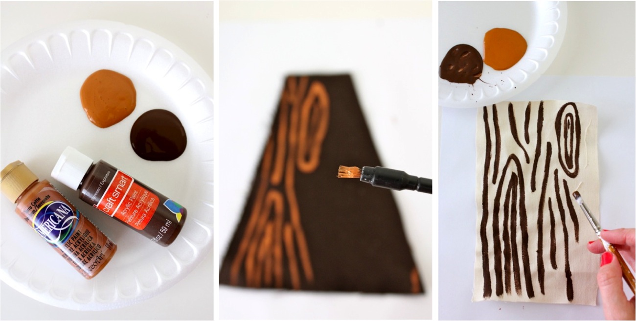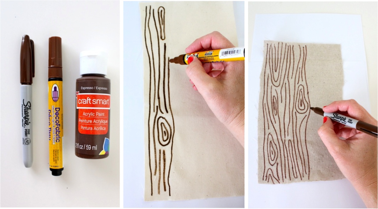 First I used a Paint Pen (middle photo above)which looked great but the pen was not so great. It kept drying it up and barely lasted for the whole piece of fabric. Next I tried a brown Sharpie (right photo above) and liked that best! It was easy to do and the thin lines were nice.
