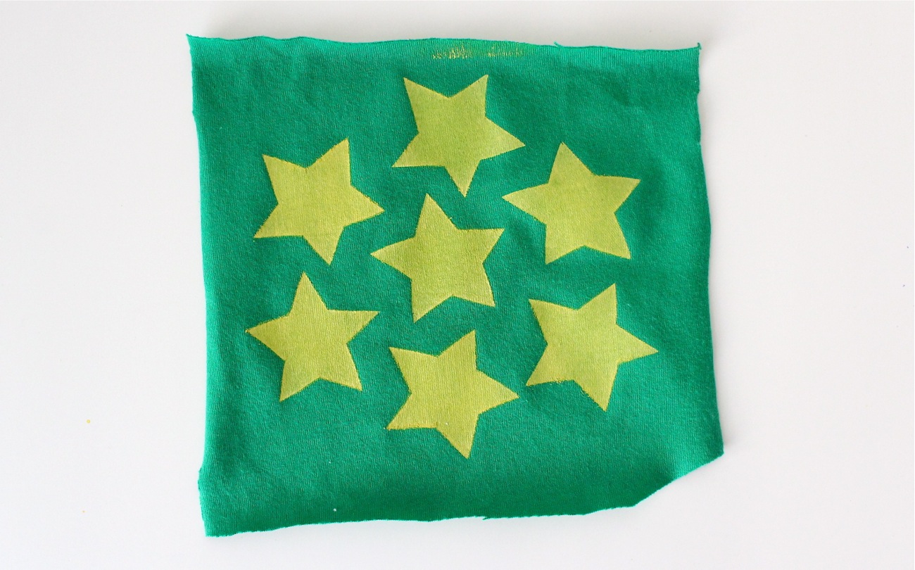 When you’re done stamping always follow the directions on the back of your paint bottle to Heat Set the paint. This “seals” the paint on your fabric so it doesn’t fade or wash away. Use a dishcloth to cover your fabric and iron for a minute or two.