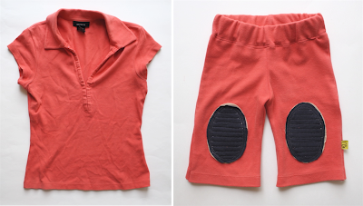 And since she offered me a bag of clothing cast-offs last week (yipee!) I thought it would be fun to give something back to her (in a refashioned way). Not sure if they’re the most boy-ish pants but I just couldn’t pass up the soft knit of this old Express shirt. The before and after: