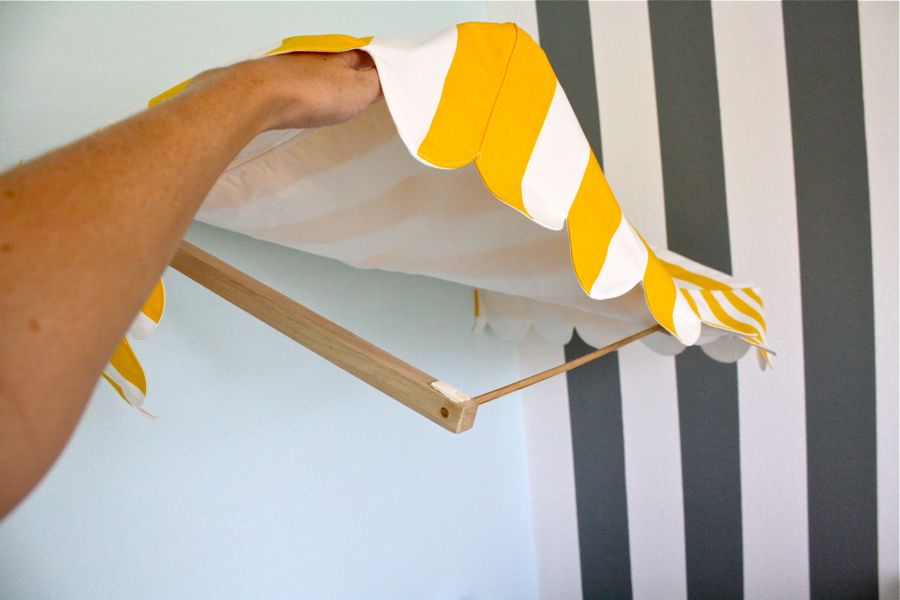 I couldn’t find any real tutorials online for making a small awning so I looked around at store/shop awnings in our town to get a feel for the concept. Basically, there’s a flat piece in the back with bars that slant down and fabric over the top.