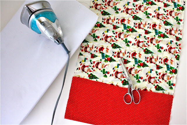 I thought the green chevron would be cutest but decided eh, not worth using on a short-lived pillowcase, right? (kind of like my feelings on kids jammies). So I went with the more vintage-looking Santa print (bought at Joanns last month).