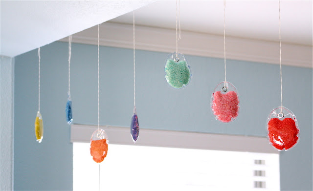 Keeping with the Split Pea Shamrocks idea, I stuffed the colored rice inside vinyl ovals, added an eyelet on top and voila….Easter Eggs!
