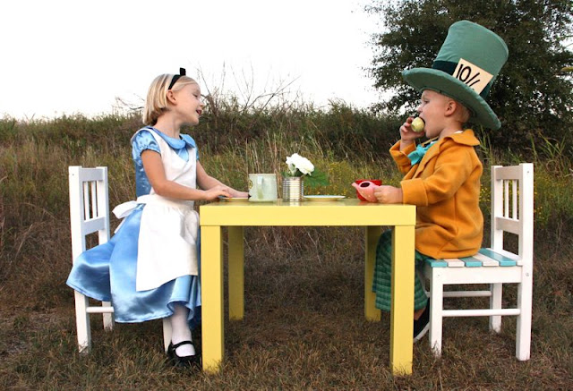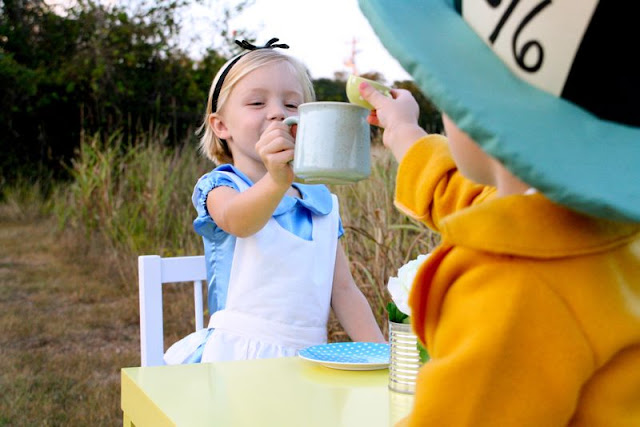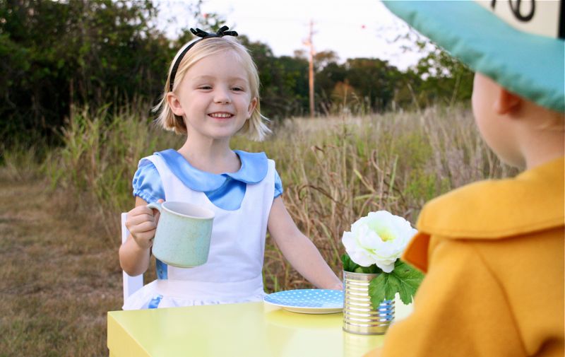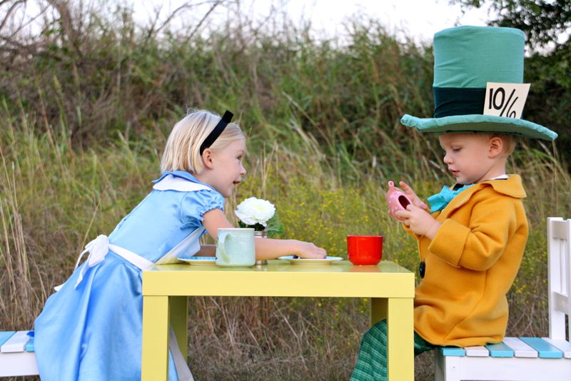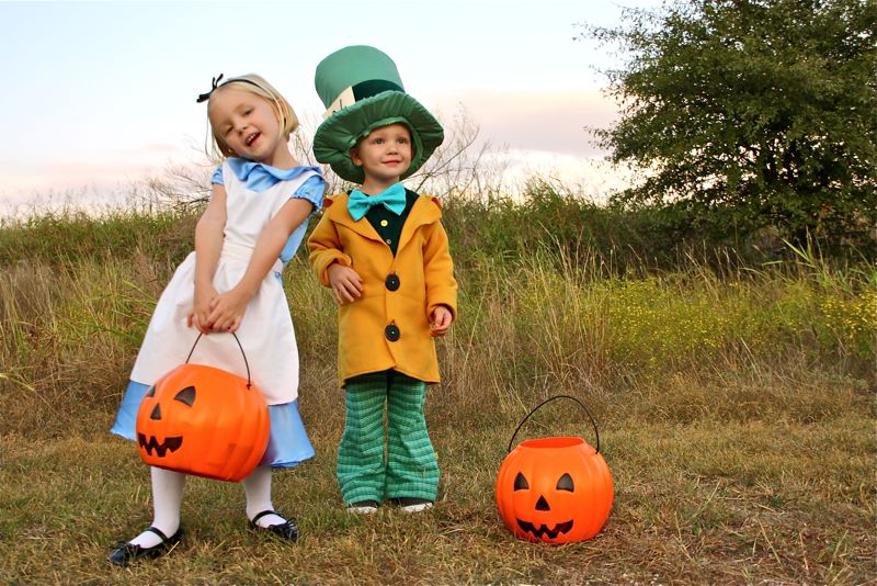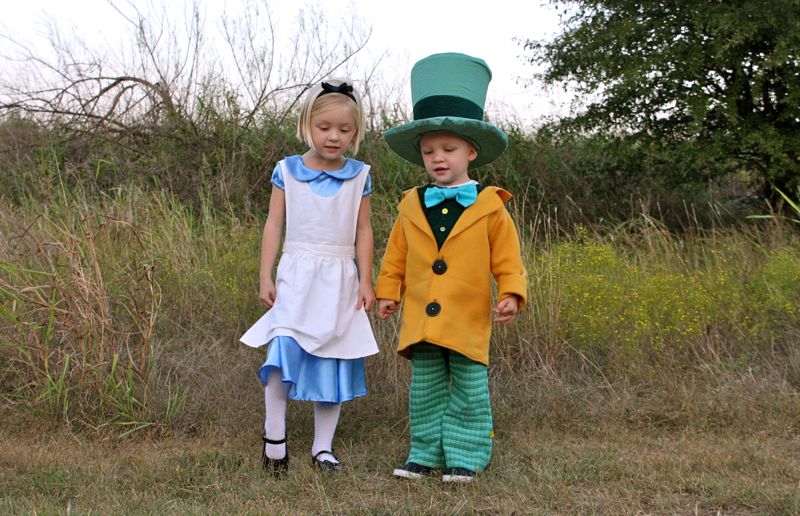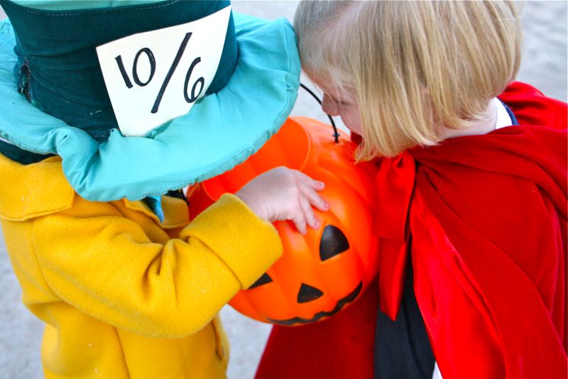 As most of you guessed from the mystery costume fabrics, yes!….Lucy and Owen are Alice and the Mad Hatter! (though Dorothy and the Scarecrow or Tiana and Naveen were clever cute ideas. Maybe next year….)