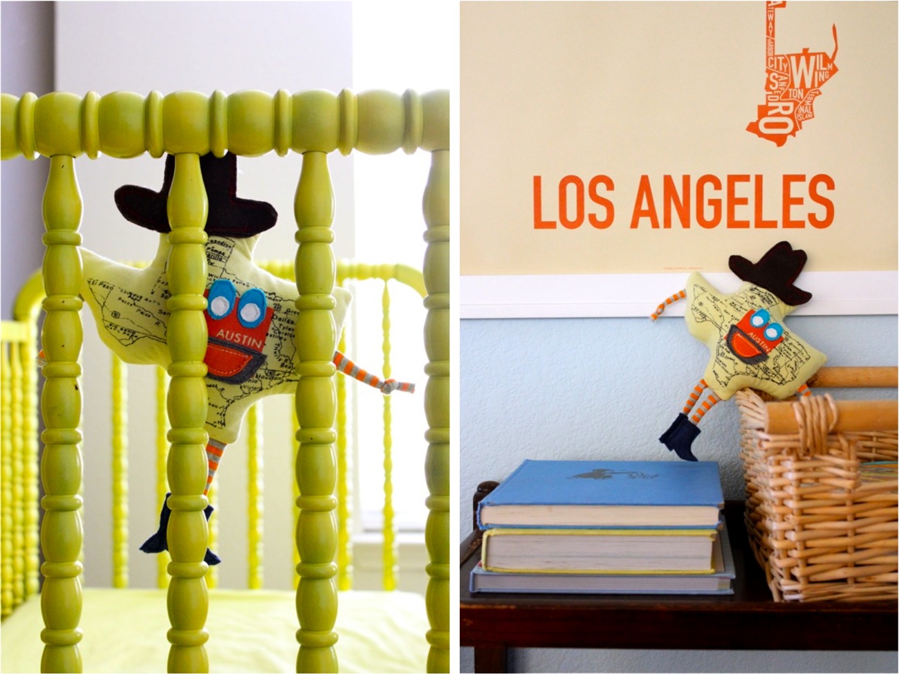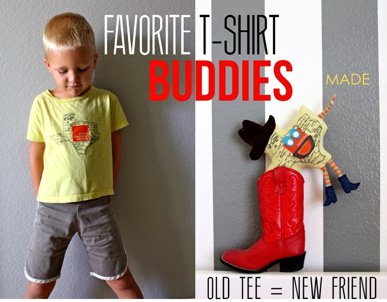 And this t-shirt from the Austin Children’s museum is his absolute fave. Whenever I ask him to go pick out some clothes, he grabs the “Texas shirt”. What’s not to love? Yellow, orange, geography, and super soft fabric. But seriously. It’s way too small now. And a while back some of you mentioned that I should make him a toy out of the t-shirt. Yes!