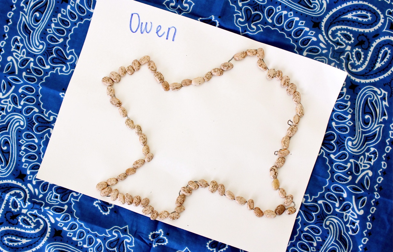 And just this week in school Owen has been learning about Texas. They made this little Texas bean picture below which is so simple and so brilliant. So I was thinking….wouldn’t it be fun to take Mr. Texas around Texas with us??