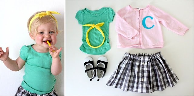 I ironed a felt C to her sweater with fusible webbing, used a scrap of fabric for the headband, and finished the look with Old Navy shoes and a T-shirt from Forever 21.