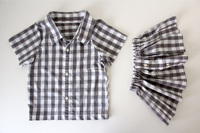 • Button-up shirt: I also used the Basic Tee pattern and extended it a bit to make a new button-up shirt from an old thrifted Mens XL shirt. I even left the collar as-is, which is a little big for the new shirt but for this project it works.