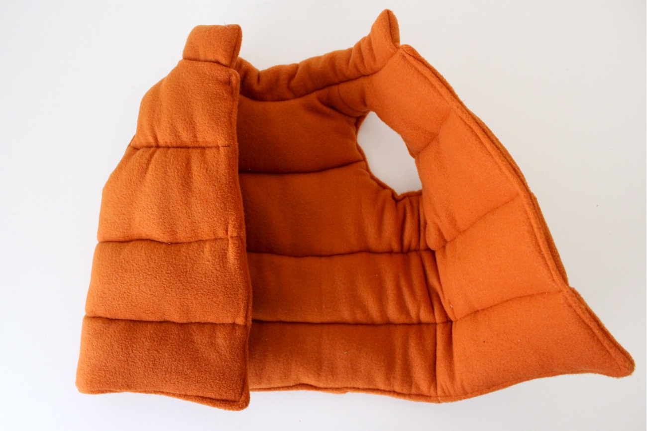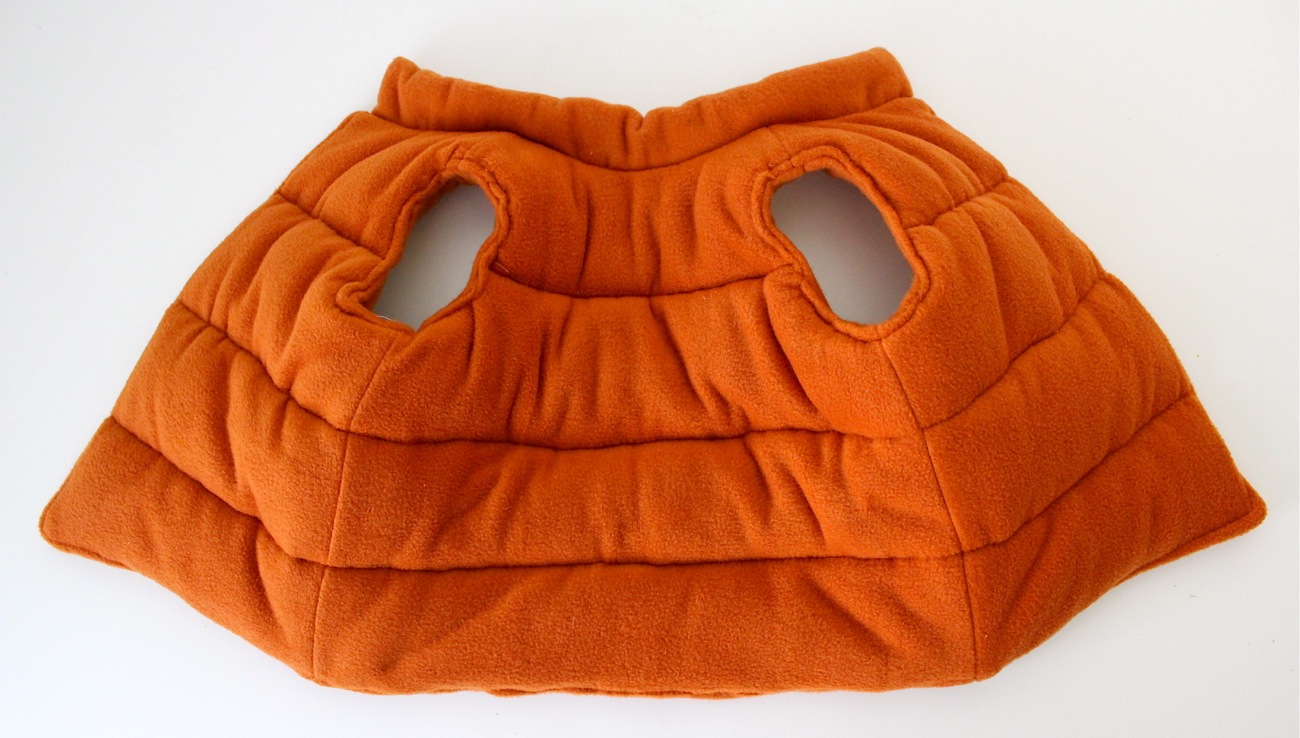 I used the Flip Vest Pattern which worked perfectly. I really wanted it to be orange nylon fabric like Marty’s vest but couldn’t find any so I went with fleece. I added a stand up collar (I’ll have to explain that in another post), sewed 4 layers of batting inside the vest, and quilted wide lines on the outside of the vest. It wasn’t a “hard” project but definitely took all my body strength to sew through the many layers. And I broke about 4 needles in the process (and couldn’t even add snap closures because the fabric was so thick). Next time I’d use a little batting. But I do love how it turned out.