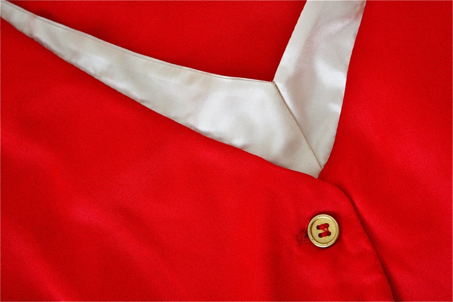 I couldn’t decide which color to use for the strip. Red seemed too boring (and hard to match), so I bought 1/3 yard each of nylon-acetate gold and ivory. I found buttons to match the existing ones as well but ended up not using them.