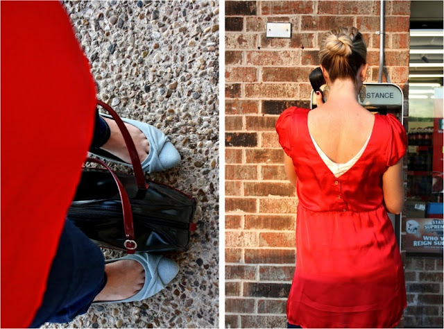 I picked up this shirt (was it a dress?) at Forever 21 last week and loved its silky, red, 70s flare. But the back was a bit too low; my bra strap was showing.