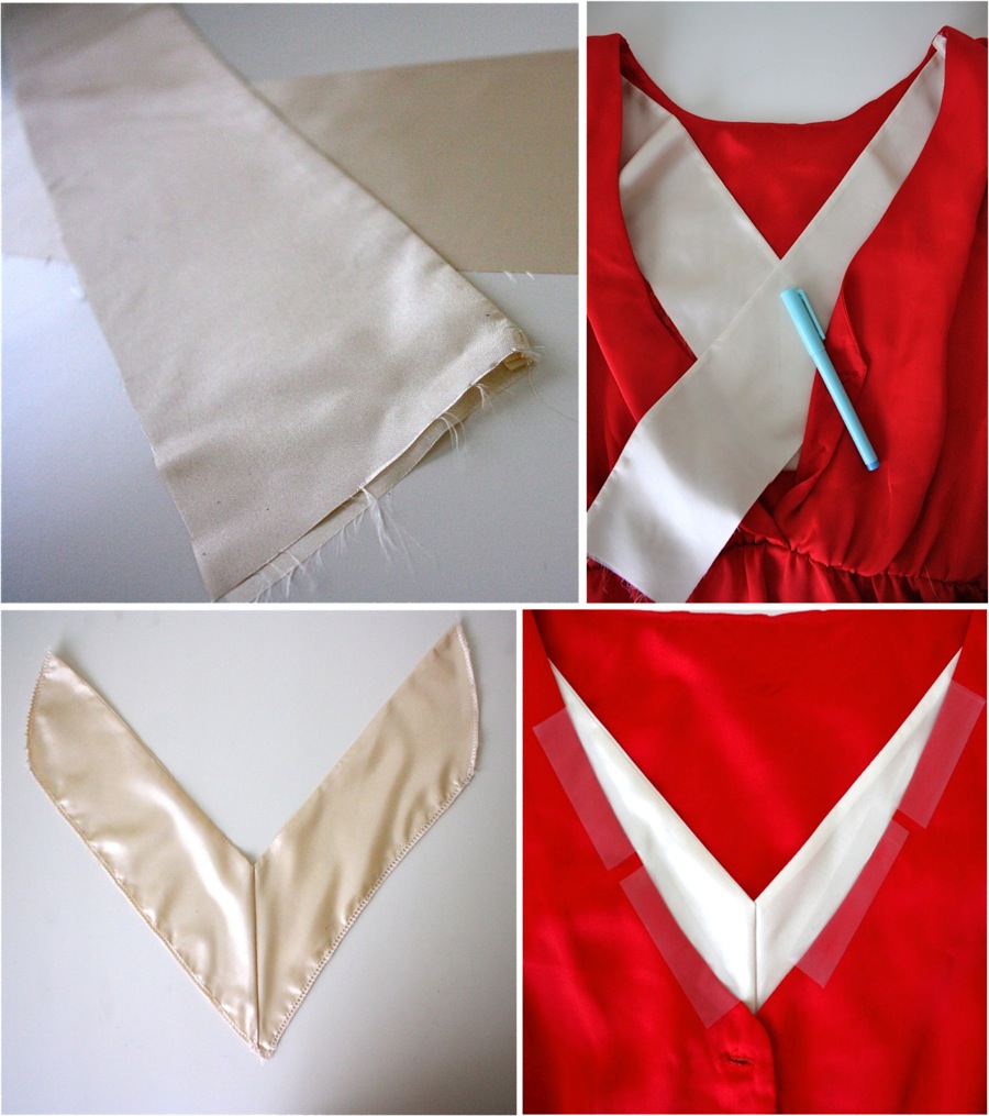 To fix the shirt…..I cut 4 strips of fabric, sewed 2 and 2 together, ironed them, laid them inside of the shirt, measured, drew a line where the fabrics should come to a “V”, sewed the 2 strips together in a “V”, and taped them in place–so I could keep it secure, while pinning it to the inside facing.