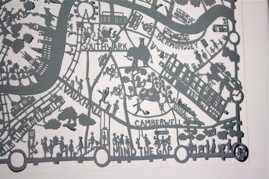 The London map above is created by a very intricate process called Mat Cutting. Julie starts with a blank mat sheet, creates her design concept, and then (pain-stakingly) cuts out all those little pieces from the mat. If you’ve ever cut with a craft knife, you know the patience it requires.