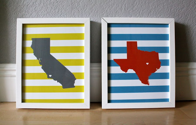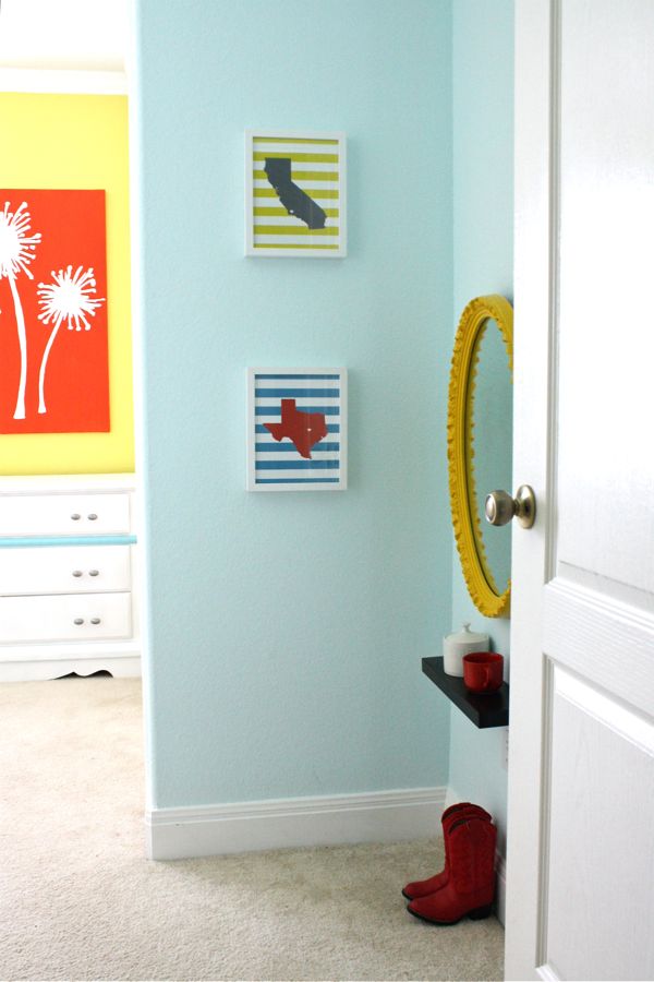 We’ve flown back and forth from Texas to California now and Lucy’s starting to understand map geography and what it means when states are far away from each other. She easily recognizes both state shapes and loves to call out their names when she sees it. So aside from being cool, cute, and full of stripes, the art is educational as well.