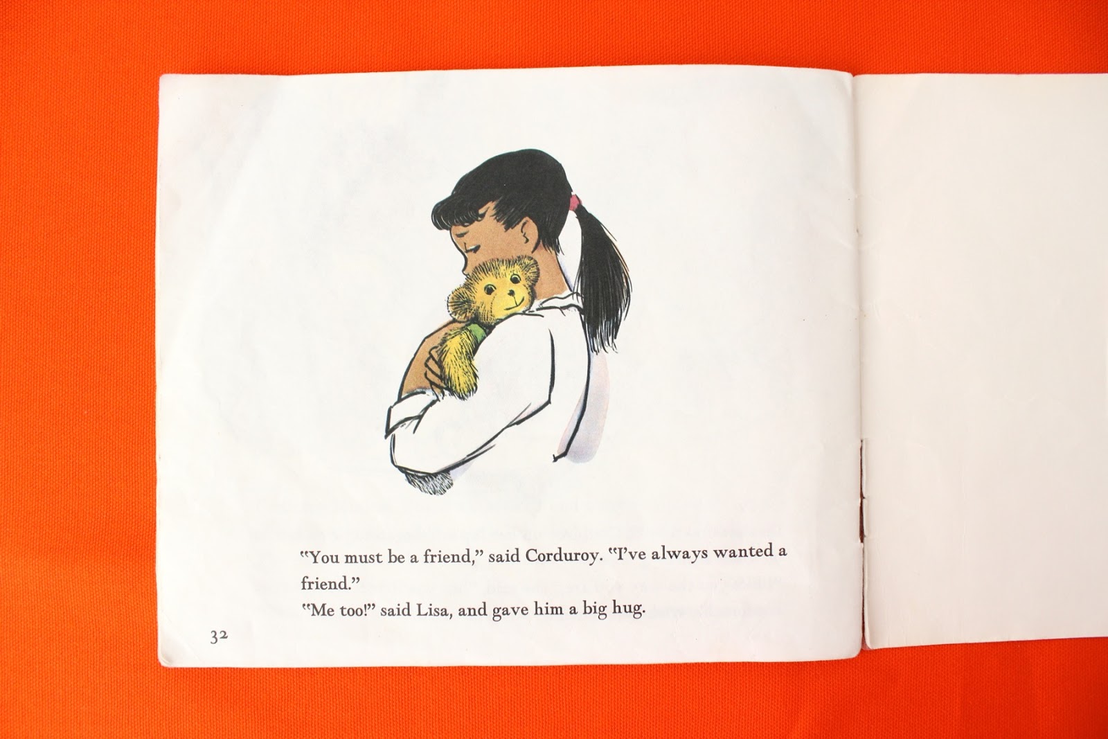 And in the Corduroy book, all he wants is to be chosen and loved by a child—to go home from the toy shop with a new owner. But he’s a bit disheveled looking, with a missing button. He doesn’t look like all the other brand news toys.