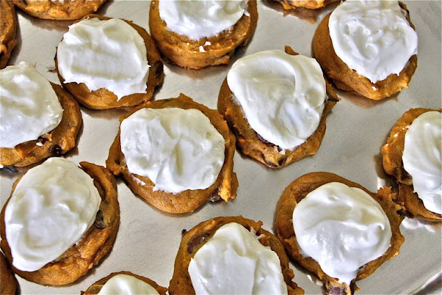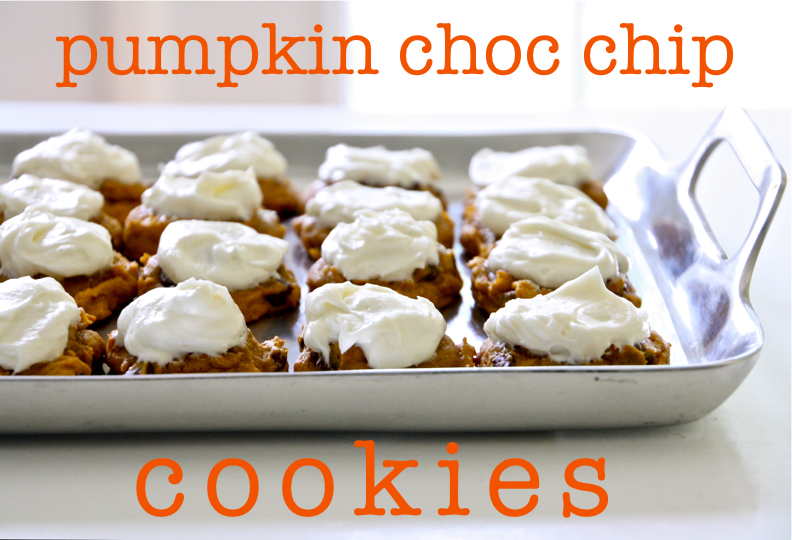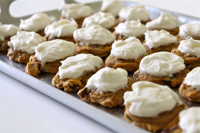 Pumpkin cookies, infused with chocolate chips, and topped off with cream cheese frosting. How can anyone say no to that?