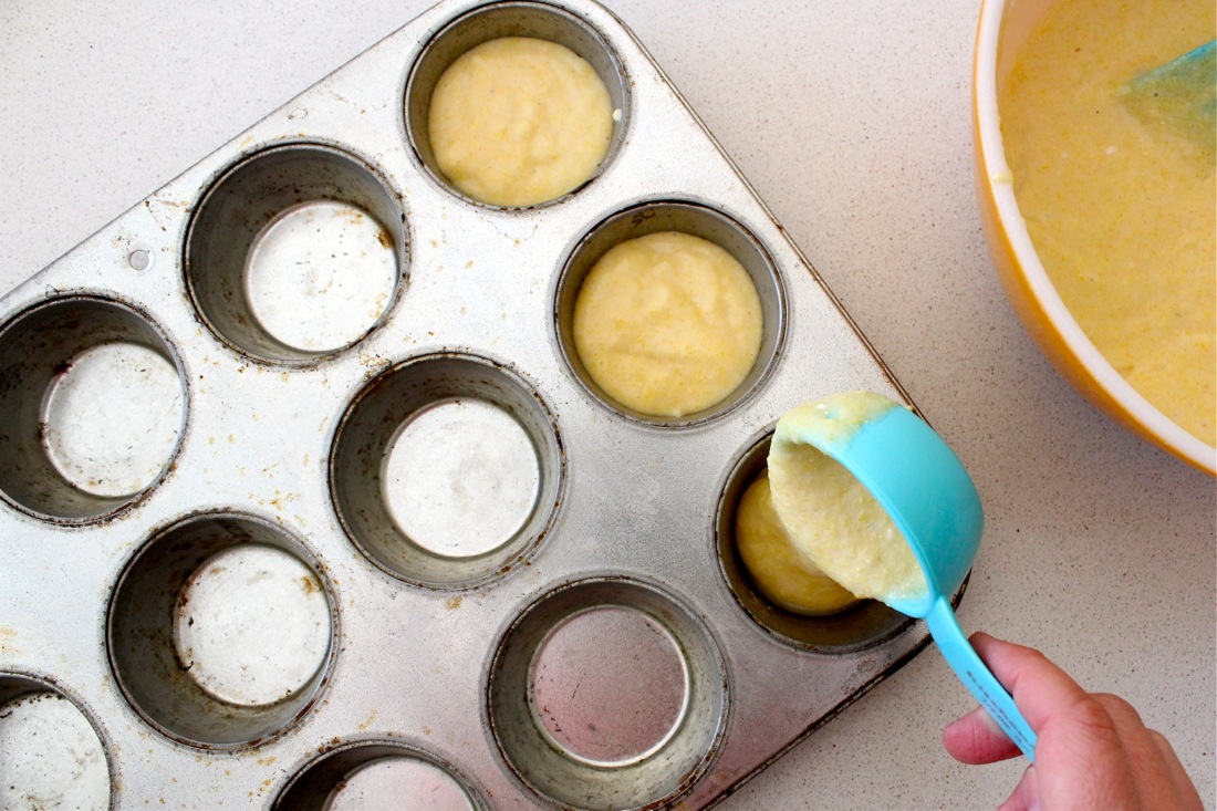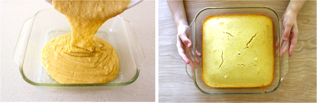 • Pour into a greased 9×9 square baking pan (or a 12-cup muffin pan for cornbread muffins)