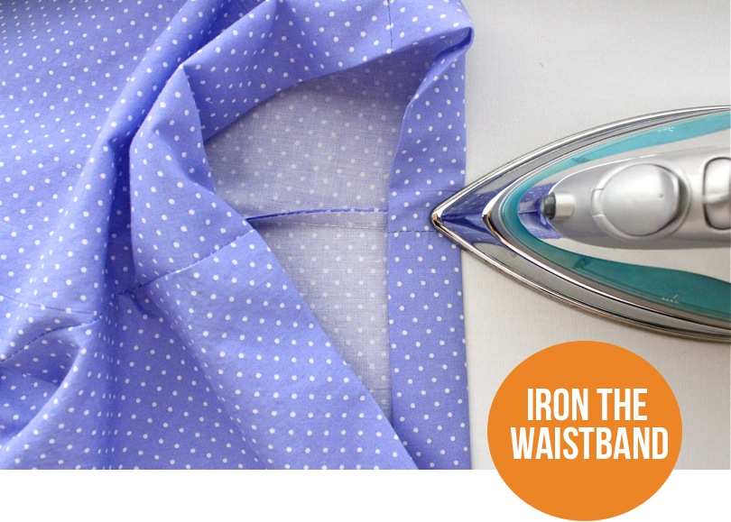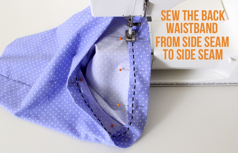 With the waistband ironed, we’re going to sew only the BACK portion first:
