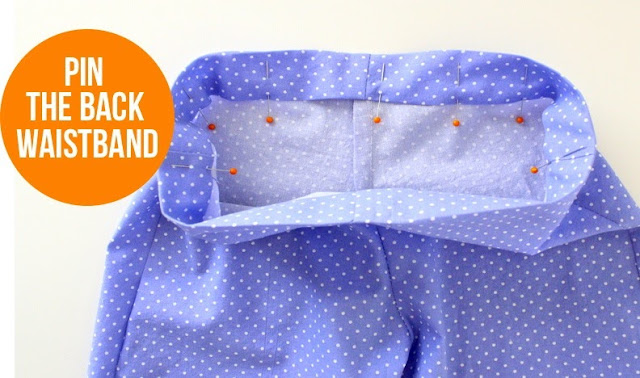 Start at one side seam and sew the waistband in place—around the back of the shorts—over to the other side seam.