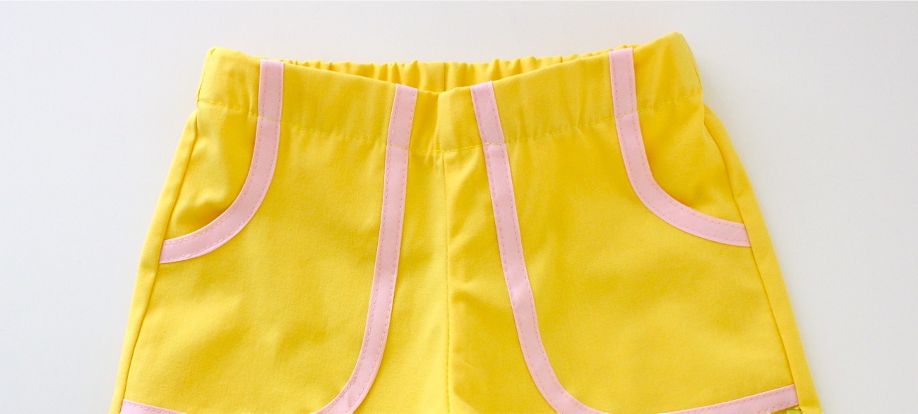 But what I’m finding works best is to NOT pin the waistband down, to start sewing, and as I sew, continually pull the fabric slightly to the left and either up or down (depending on where I am on the waistband. I do this with my left hand, to get it as smooth as I can underneath the waistband. I use my right hand to hold the shorts and feed it through the machine. This distributes any small bits of excess fabric throughout the Flat Front. And you can see on this yellow pair of short below, there are a few small “gathers” but overall it looks great and in reality, once your kiddo has her shirt and shoes on….no one will even notice such minor imperfections.
