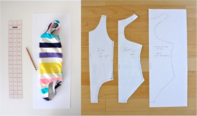 I started by tracing one of Lucy’s recent swimsuits to get a perfect fit. I first made two rough pattern pieces. Then after sewing the entire leotard went back and retraced, making adjustments where needed. I always label each pattern piece with a “version” number and the date to keep everything orderly.