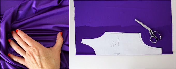 • It’s important to determine the direction of the stretch before cutting. Some spandex has 4-way stretch which means it stretches vertically and horizontally, some only has 2 way stretch (like the purple fabric below). Use your hands to stretch it both horizontally and vertically. You want the stretch to go horizontally across the body so it can stretch with your tummy.