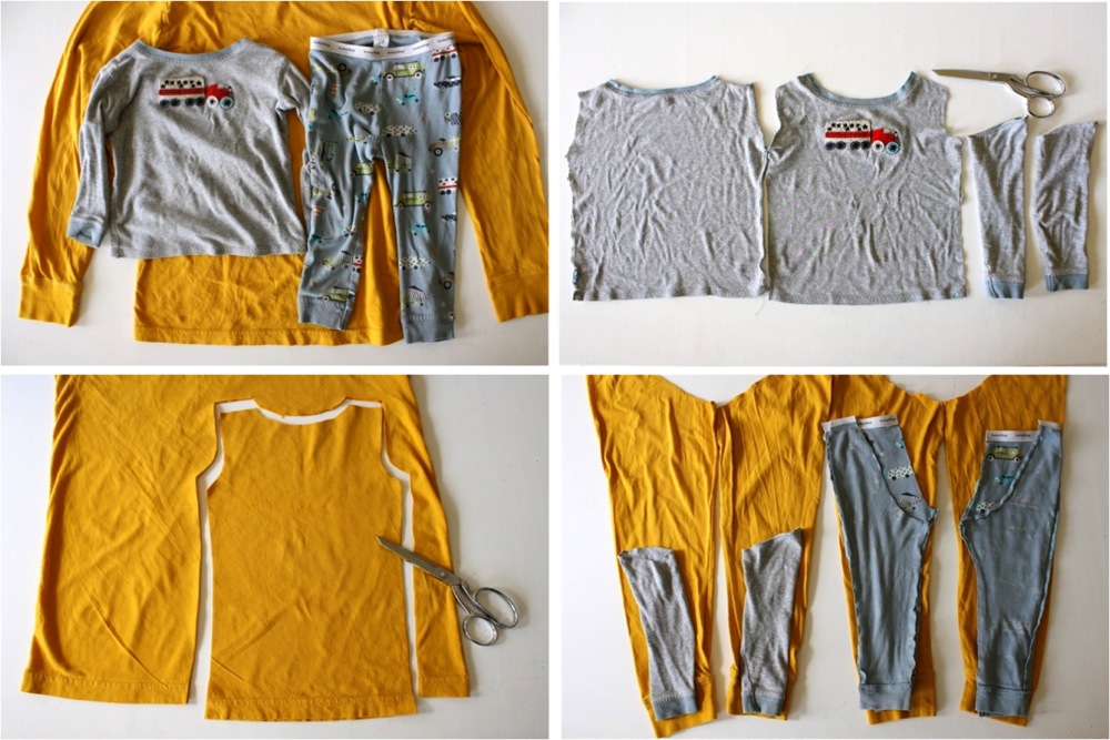 * I used a pair of Owen’s worn out pjs and cut them up for pattern pieces. If you don’t want to cut things apart, turn them inside out and trace to create new pattern pieces (following the Make Your Own Pattern tutorial).
