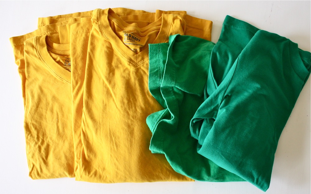 They’re made from men’s XL t-shirts–with the gold fabric as the base and the green stripes sewn on top. I found the shirts at Old Navy Clearance. The long sleeves of the gold shirts were perfect, since the existing sleeve cuff could be used for the for pant leg cuffs and the new shirt sleeve cuffs (I purchased two gold shirts).