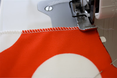 When working with lined fabrics, I like to serge the two pieces together so it feels like they’re fused together. This makes it easier for sewing everything together later (so things don’t shift). This is the same method used when making my carseat covers (I serge the batting to the fabric before sewing anything):