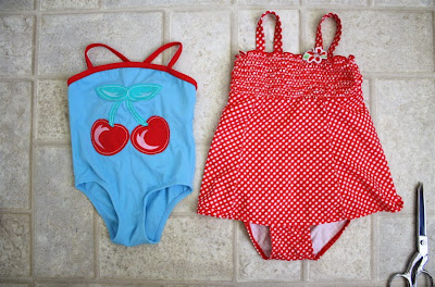 Many readers have asked/questioned how I sew without patterns. I don’t entirely wing it; you know, just cutting away at whim with an vision in my mind (ah, I wish. Then I could actually dream about being on Project Runway one day). As with a pattern, I need something tangible to guide me along the way. Often times, that’s an existing piece of clothing that my kids already own. Since this is my first swimwear attempt, I’m starting simple. I’ll be using Goose’s old swimming suits as a guideline: