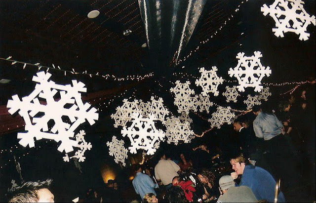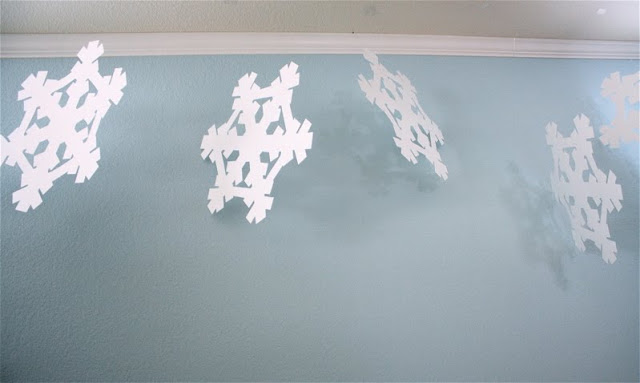 But years ago, I used this concept to decorate for a very large party. We hung hundreds of flakes inside a tall building with strings of lights and glittery/shear fabric, all meeting up in the middle of the ceiling (creating a tent-like effect). It was very fun and very festive:
