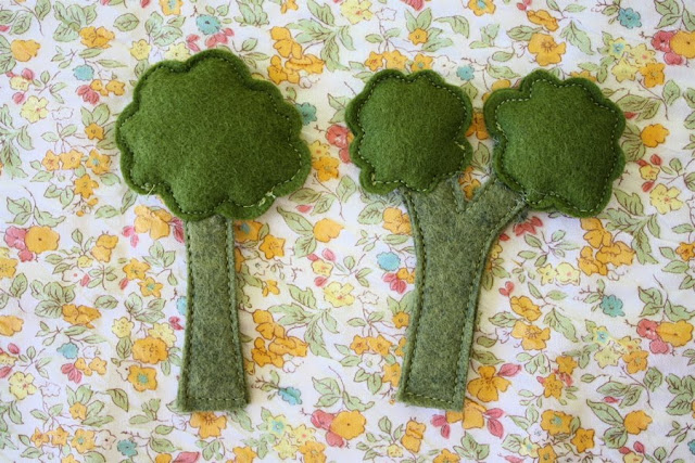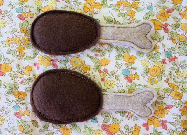 I made all of the food items out of felt; most of them double-layered and some with velcro attachments so the food can be separated.