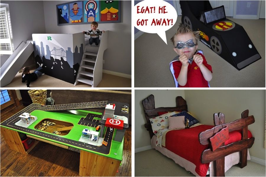 I’m not sure which is my favorite–the mustache cake plates–or the superhero mask–or the rex socks? Okay, I like it all! But if I really had to choose my favorite thing about Cheri’s site, it’s gotta be her home improvement projects. Her house is a boy’s playground! She recently transformed the boy’s bedroom into a superhero room with a bed-loft/slide. She created a batmobile car/reading nook. And just this week she posted a new car table that she whipped up on a Saturday.