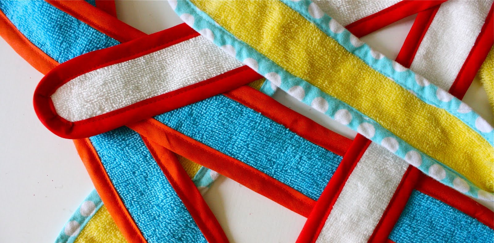 The Beach Robe is made from a large beach/bath towel and bound with simple bias tape. You can also use normal terry cloth fabric but I find that the cutest terry cloth is in the towel aisle of your local retail store.