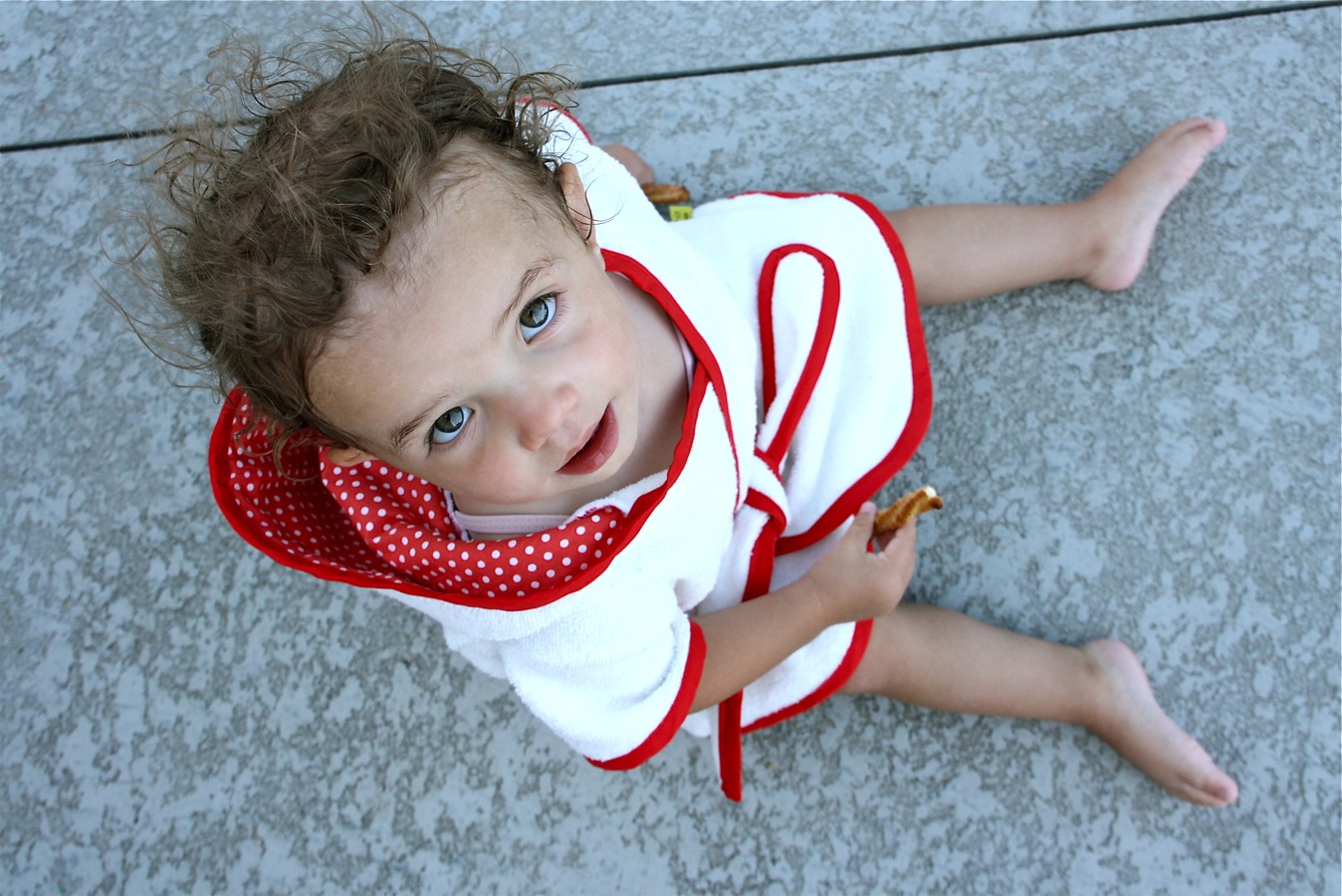 A few years ago on a whim we took Lucy’s bathrobe to the pool and I decided that it was the only way to go. The robe was warm, cozy, and didn’t fall off as she tried to eat her post-swimming snack.