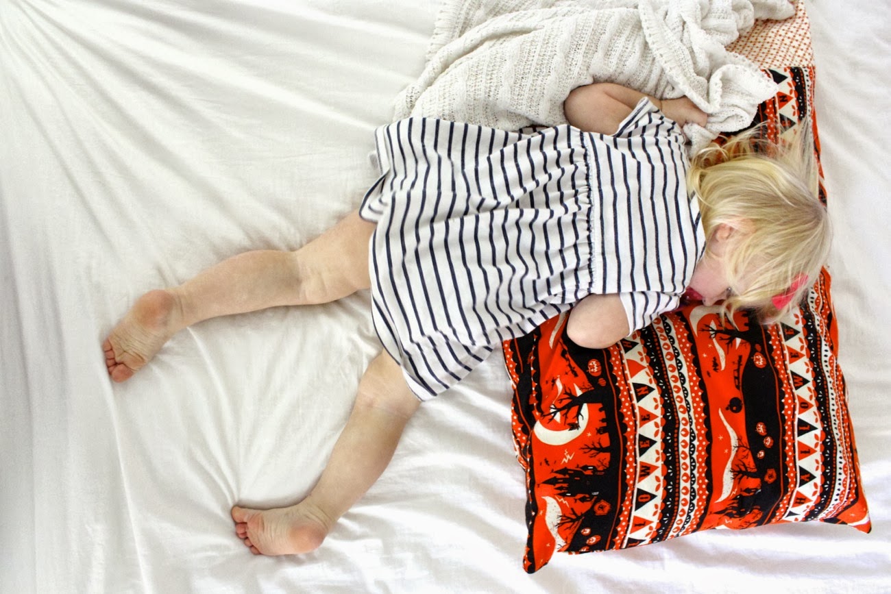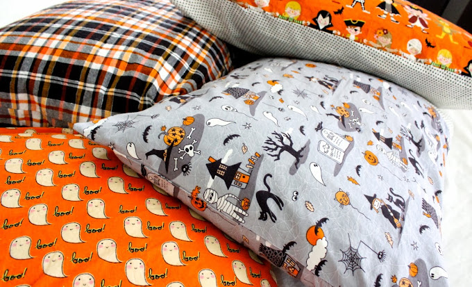 So we headed to the fabric shop and I let them pick out any print they loved (the kind of stuff that my minimalist design brain would probably walk past). But pillowcases and jammies are the best place to let the random fabrics run free. And free they went!, creating a halloween storm on my bed.