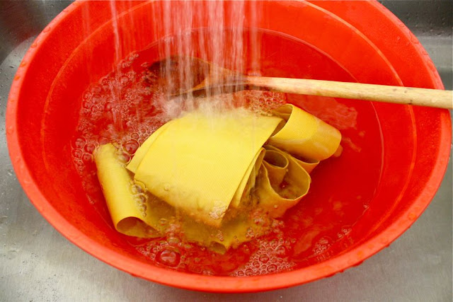 Then throw in your elastic (or other items). Don’t overcrowd the bowl or your items won’t get an even dye. But don’t waste the chance to turn plain white into lemon yellow! If you have an extra baby onesie or a white T-shirt, throw them in too! Make the most of your dyeing efforts.
