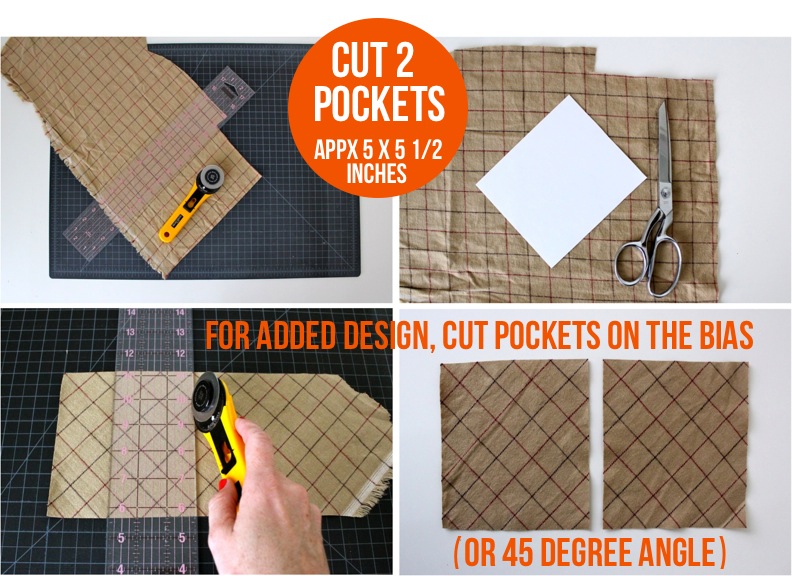• Cut two pockets appx 5 x 5 1/2 inches (for this pattern)….or cut them any size/shape you want! You can even angle the pockets into a V at the bottom.