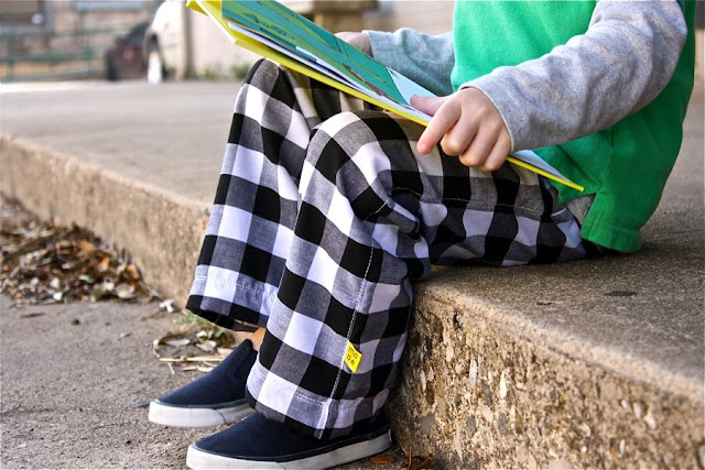 The perfect pants for a chilly day in our old downtown square, as Owen reads his favorite book from the library–There’s a Wocket in my Pocket…and turns his head when we get to the Bofa on the Sofa. The mean looking Bofa is intimidating.