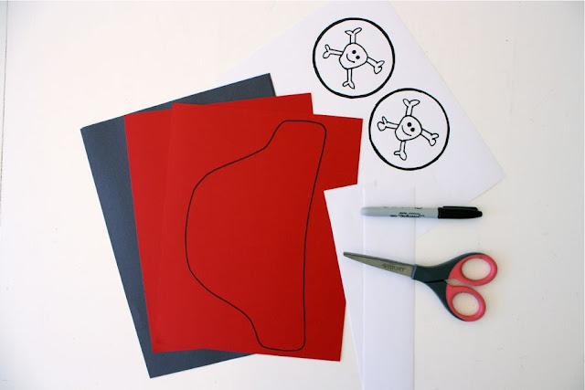 Print the template (one page) from your computer and cut out the pieces. Use the hat piece as a pattern to trace onto colored cardstock or construction paper. The Jolly Roger crossbones circle can be used as-is or you can draw your own.