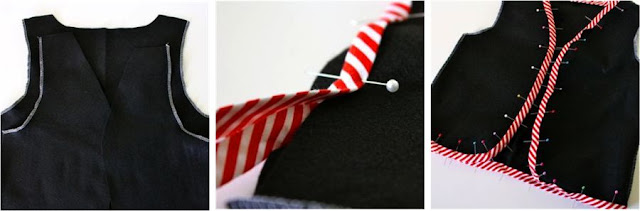 Sandwich all the vest edges and the neck in one continuous line with bias tape and sew it in place.