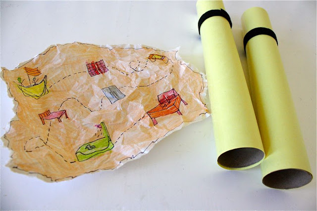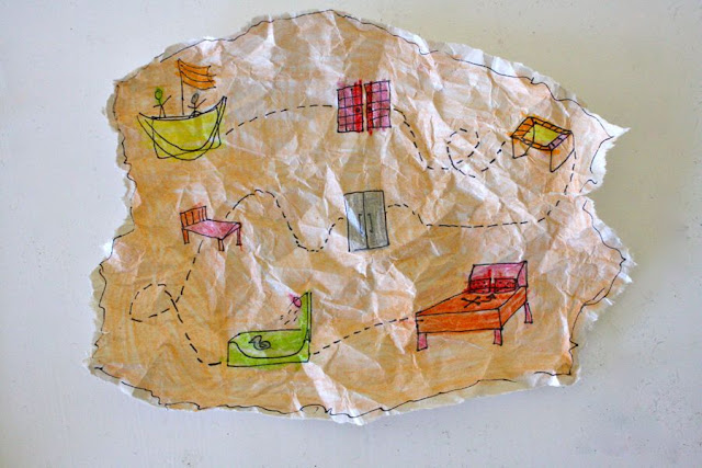 Tear the edges of a piece of construction paper. Draw pictures of certain locations from throughout your house, leading the kids on an adventure from room to room till they get to the final spot with an X (and find some treasure).