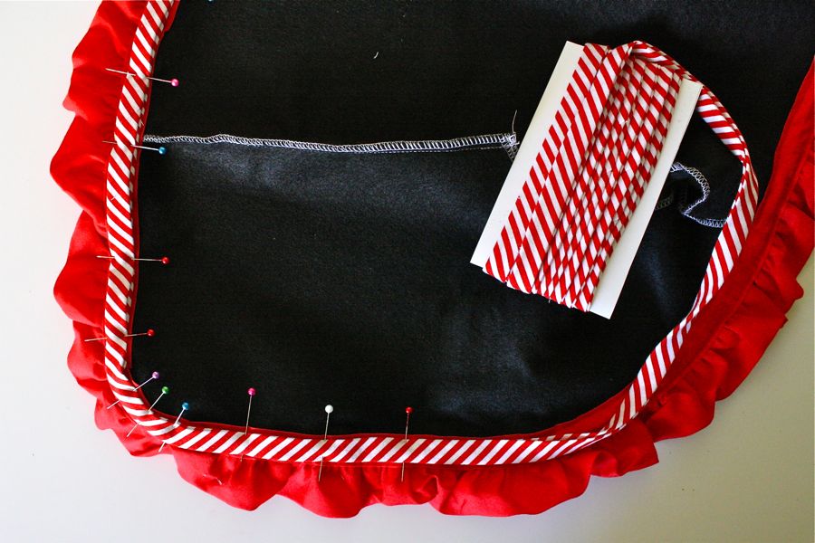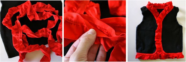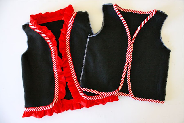 For a girlier look (or for a fancy pirate captain) you might add ruffles to the vest. I had some ruffled quilt binding in my drawer (made by Wrights, often carried in stores and sold by the yard). It’s like bias tape, so just sandwich around the edges and sew it in place. OR…make your own ruffle and attach it with other bias tape around the edge!