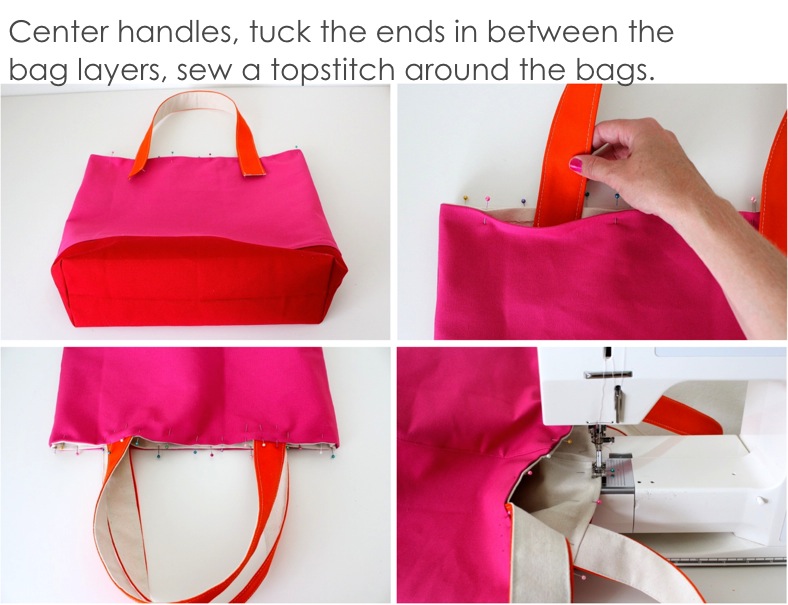 • Determine where the handles should go (mine are about 3 inches in from the sides). Then tuck the ends of each handle in-between the two bag layers, with about 2 inches of handle dangling inside. You may need to remove a few of the pins from above to do this.