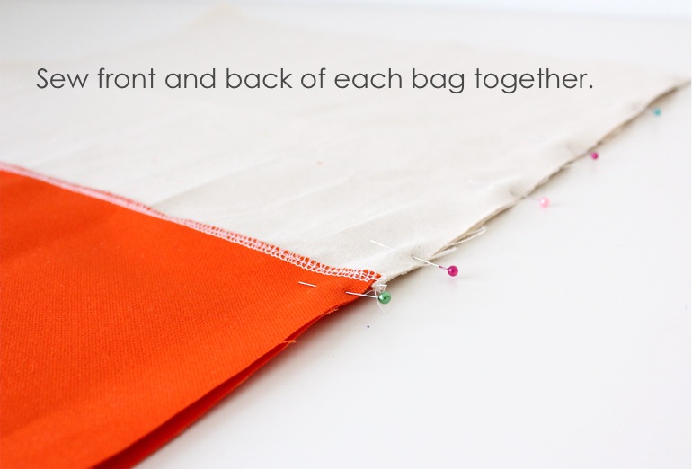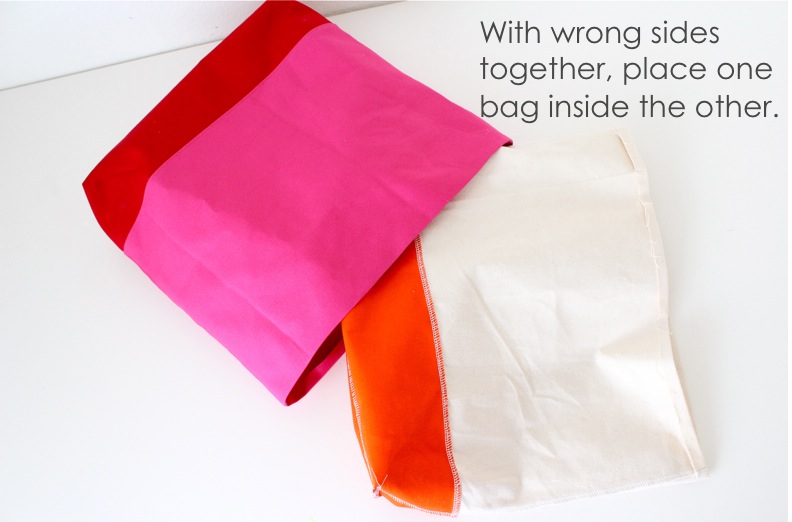 With right sides of the fabric together, sew each bag together (separately, like you’re making two bags. For more info see the Basic Tote tutorial).