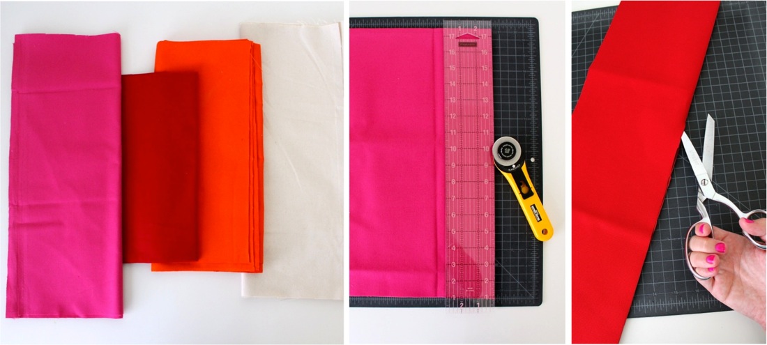 Start by cutting all your bag pieces. We’re using Duck Cloth which is like a heavy canvas. It’s very durable and typically comes in solid colors (though I’ve seen some fun prints at Hobby Lobby). Of course you can use other cotton fabrics as well.