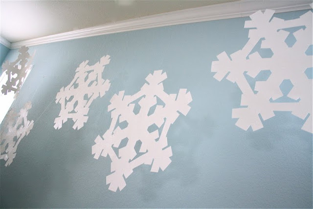 Each flake is made from a full-size poster board sheet and painted with glitter. Just watch them sparkle as they dance from the roof.