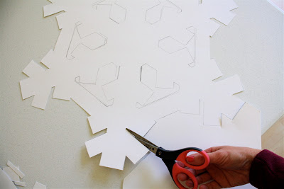 Trace your snowflakes, one per posterboard, and cut each one out with scissors. Be careful as you cut the inside portions of your flakes, that you don’t tear anything:
